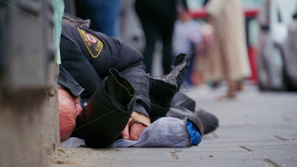 Close-up of a homeless old man sleeping on the pavement wrapped in a black jacket with blurred street on the background in London, England Royalty Free Stock Video Footage