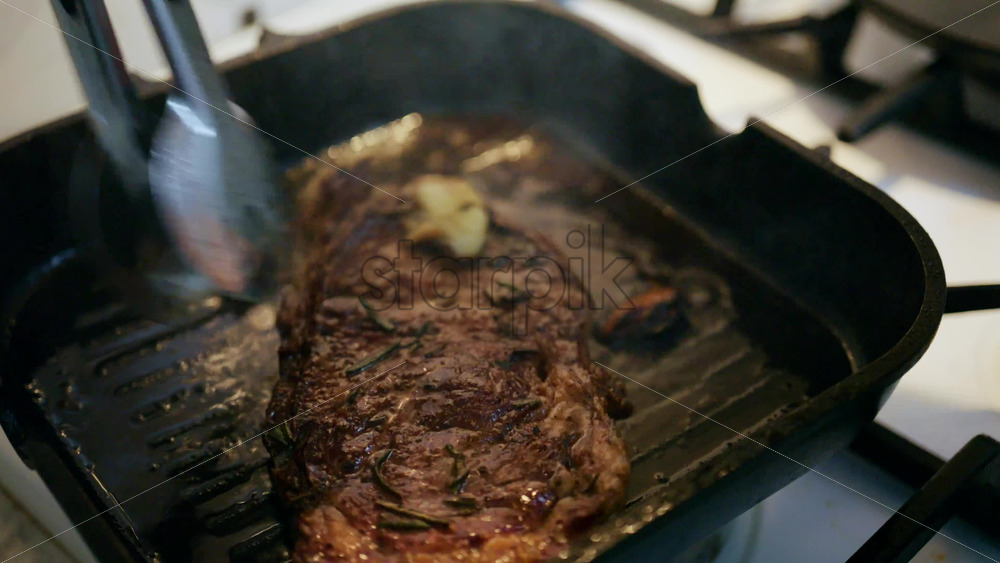 Cooked steak browning in a grill pan while being basted with melted butter and herbs