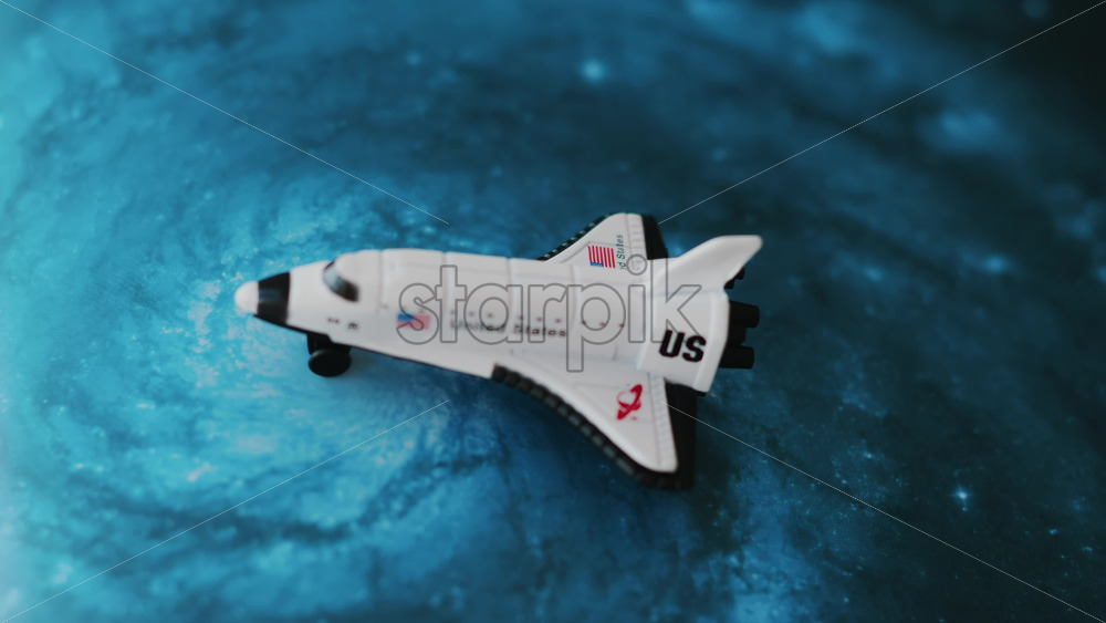Video – Close up of a miniature toy space shuttle placed on a blue cosmic galaxy backdrop