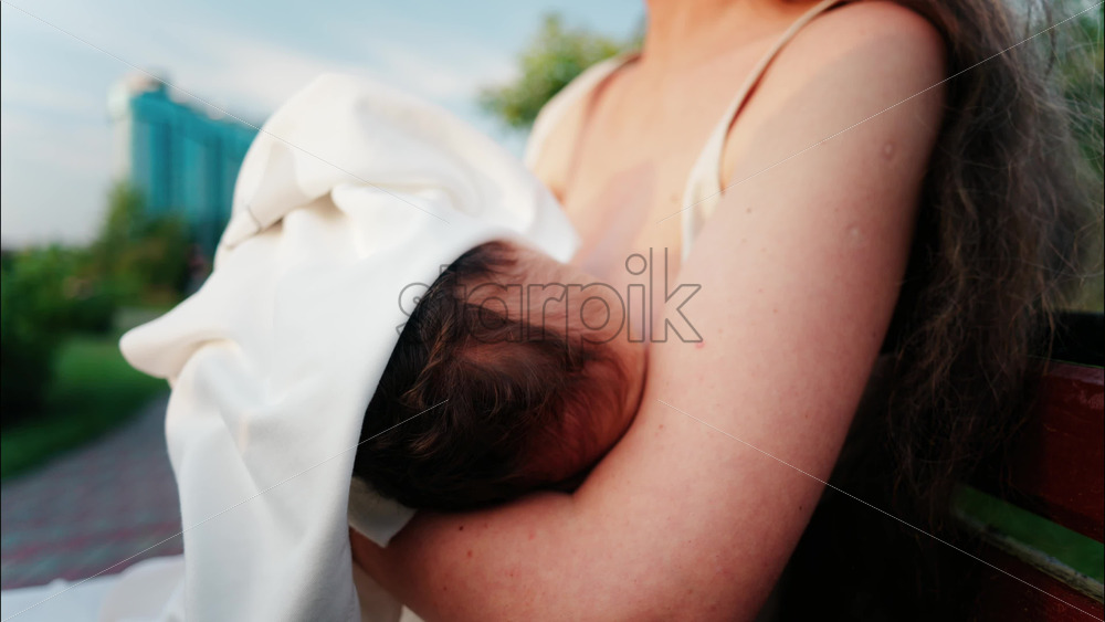Video – Close up of a mother holding her newborn in her arms outdoors during sunset