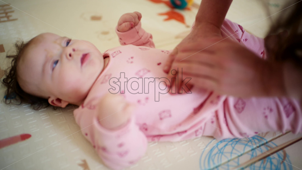 Close up of a mother’s hands softly massaging the baby’s belly as the infant looks upward