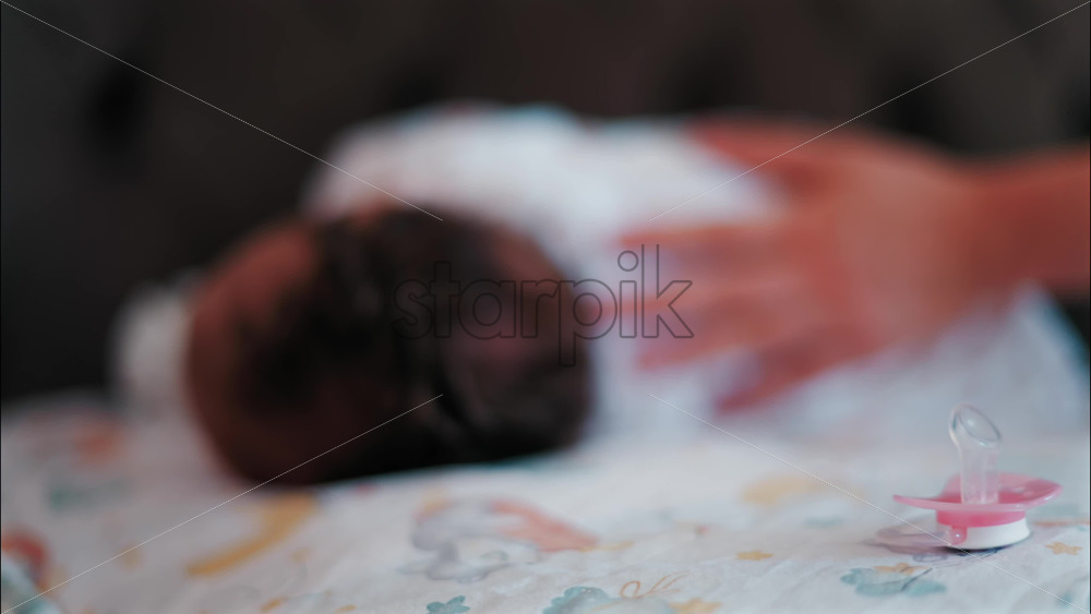 Close up of a pink pacifier with a baby lying down and sleeping peacefully in the background Royalty Free Stock Video Footage