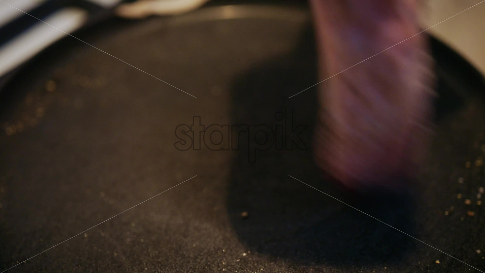 Close up of a raw beef steak being seasoned with salt and black pepper in a pan