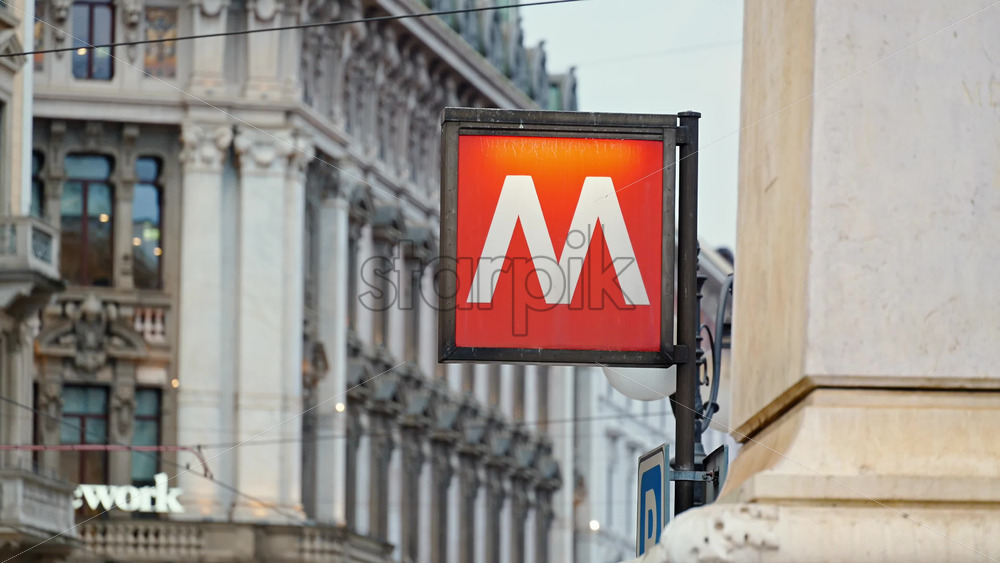 Close up of a red metro sign with a building on the background in Milan, Italy in daylight Royalty Free Stock Video Footage