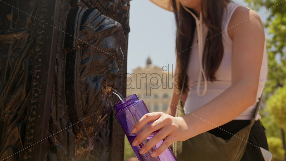 Close up of a reusable bottle being refilled at an ornate cast iron drinking fountain on the street in Valencia, Spain Royalty Free Stock Video Footage
