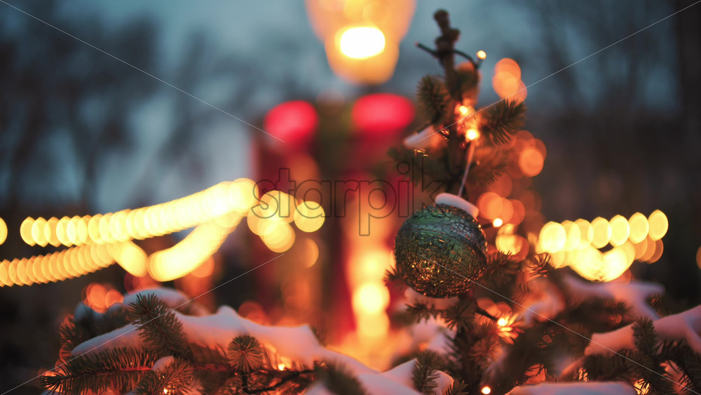 Close up of decorative hanging ornaments covered with snow and surrounded by warm string lights in an outdoor winter setting