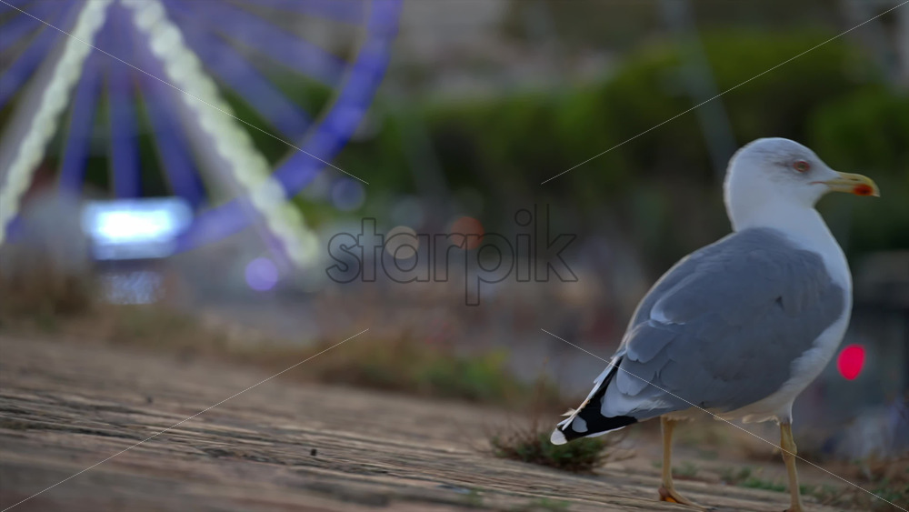 Close up of a seagull standing with a blurred view of a lighted ferris wheel Royalty Free Stock Video Footage