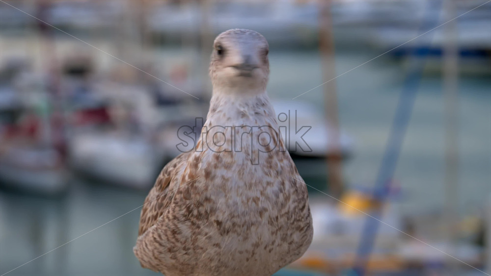 Close up of a seagull walking with a blurred view of boats docked in a harbour Royalty Free Stock Video Footage