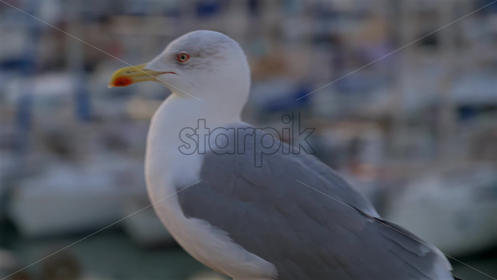 Close up of a seagull walking with a blurred view of boats docked in a harbour Royalty Free Stock Video Footage