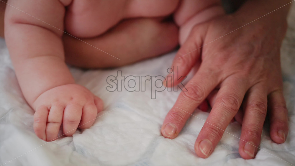 Tender moment of a baby holding an adult’s hand while receiving a gentle massage