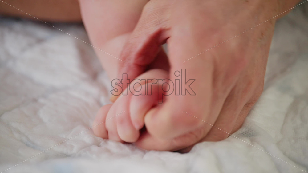 Tender moment of a baby holding an adult’s hand while receiving a gentle massage