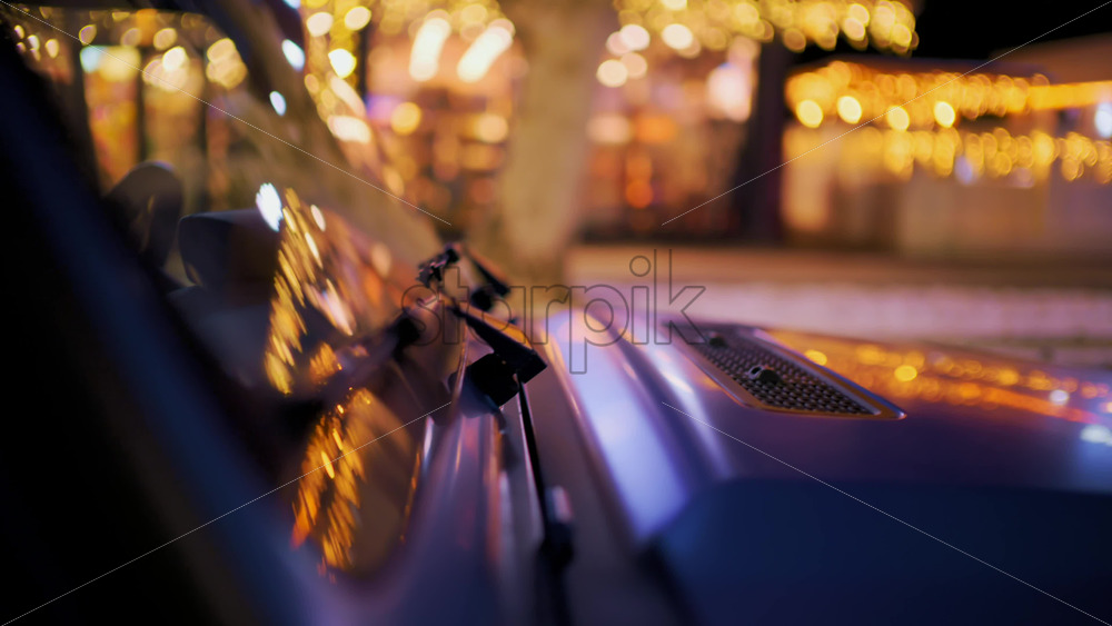 Close up of a vehicle hood reflecting warm golden city lights at night