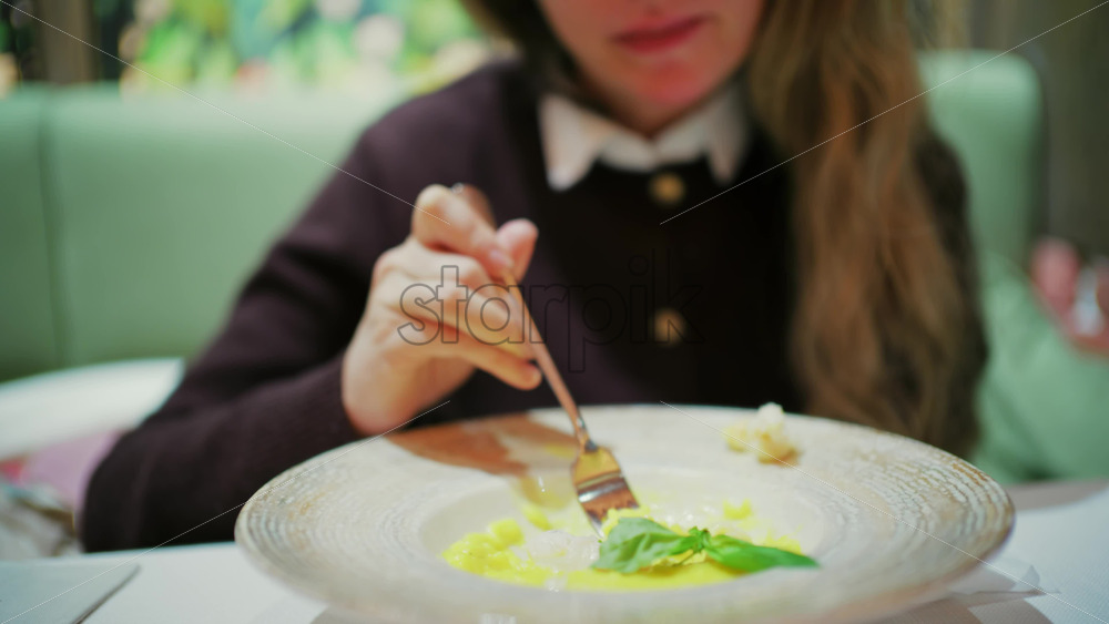 Close up of a woman’s hand cutting into a gourmet meat dish served with sauce, greens, and rosemary garnish on a white plate Royalty Free Stock Video Footage