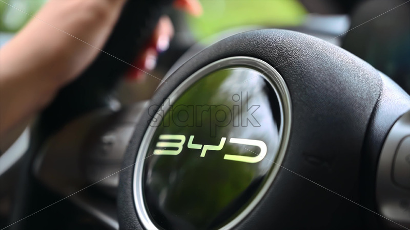 Close up of a woman holding the steering wheel while driving an electric BYD car, increasing the speed Royalty Free Stock Video Footage