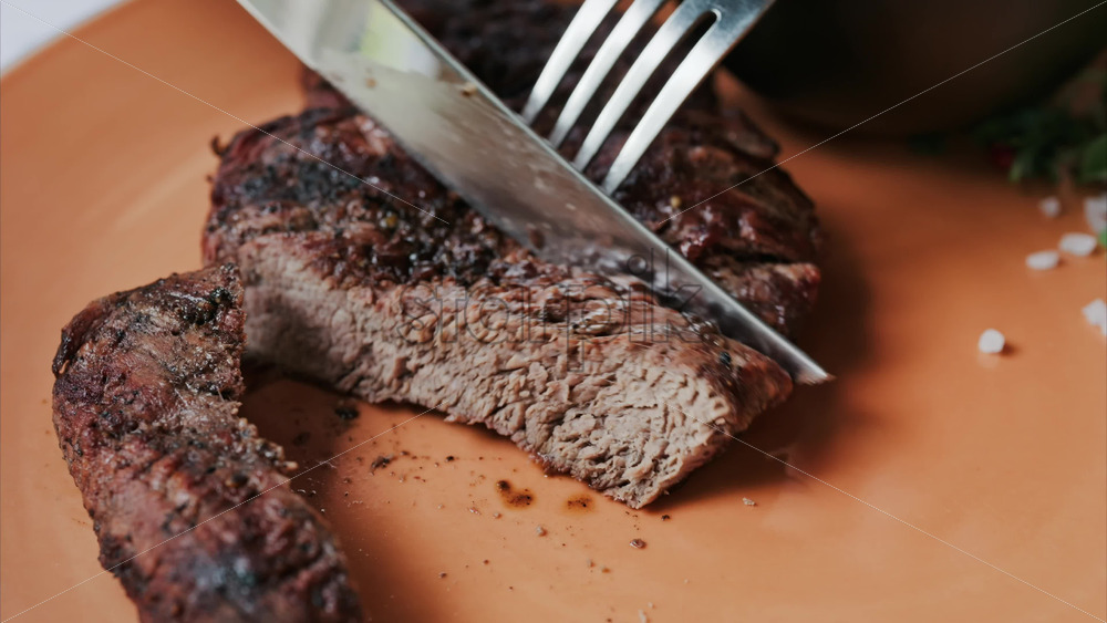 Close up of a woman’s hands cutting a Sirloin Steak with Barbecue Sauce and micro-plants on the side Royalty Free Stock Video Footage