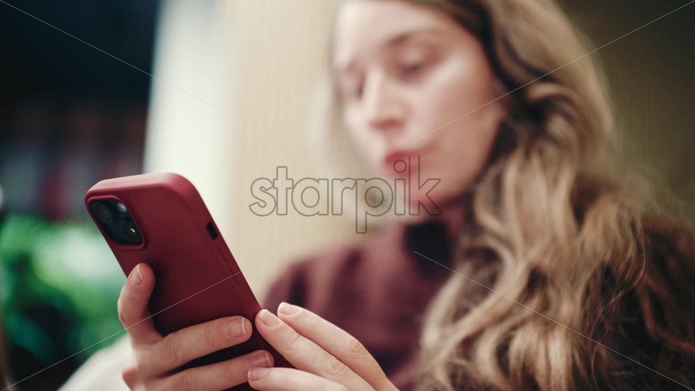 Brunette woman scrolling on her phone at a restaurant Royalty Free Stock Video Footage