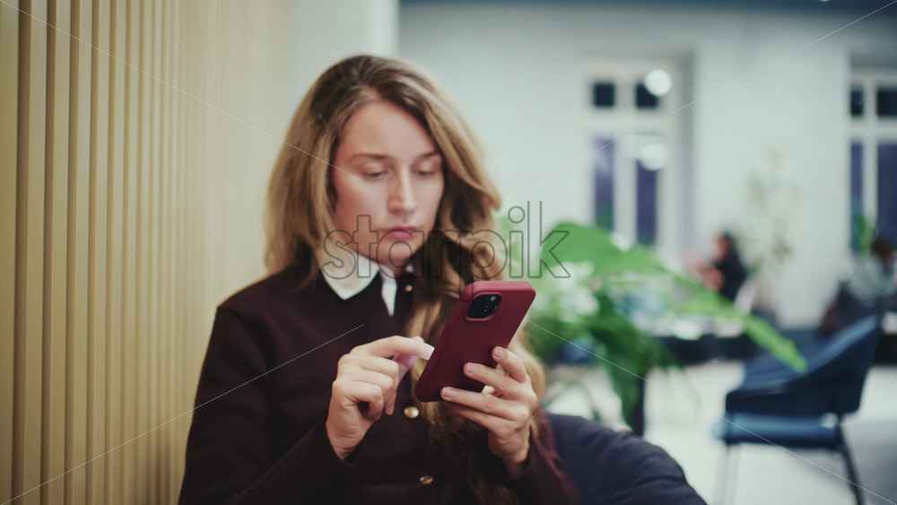 Close up of a woman using a smartphone indoors in soft evening light