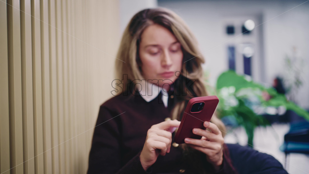 A woman seated indoors, focused on her smartphone in a modern, minimal interior