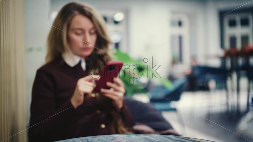 Woman seated indoors at a cafe table, focused on her smartphone