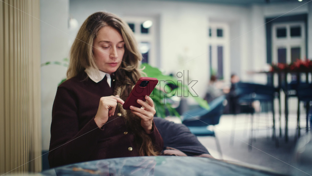 Woman seated indoors at a cafe table, focused on her smartphone