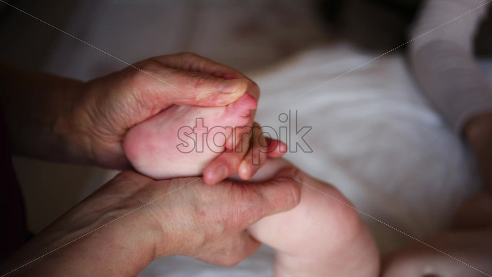 Home » Shop » 1 Video » Close up of adult hands gently massaging a baby’s foot and sole