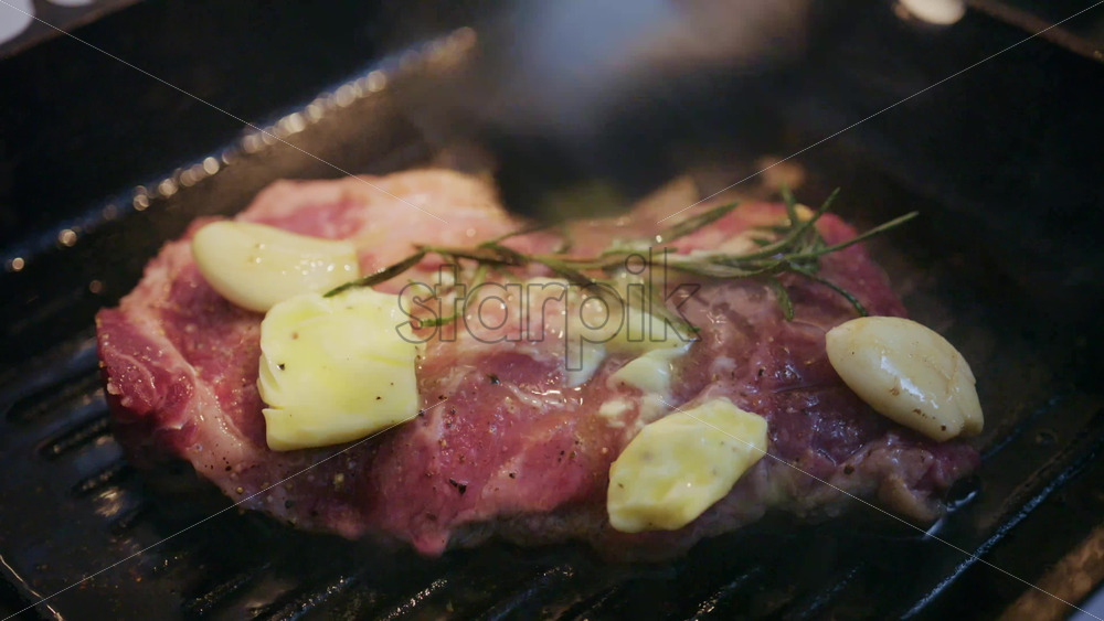 Garlic cloves and butter added to a steak while cooking on a grill pan