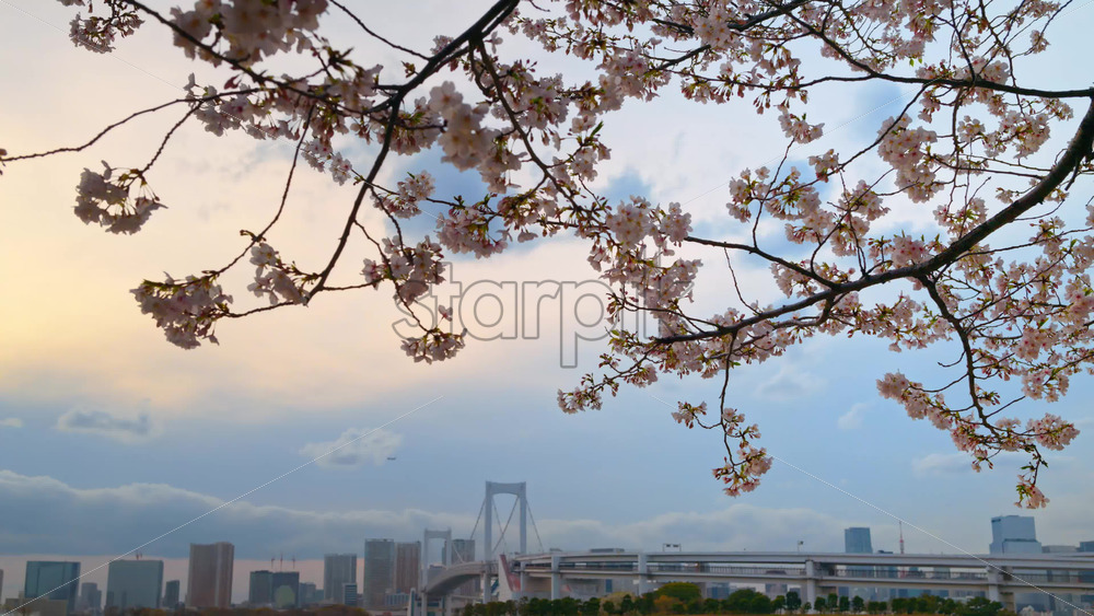 Close up of cherry blossoms with a distant view of the Rainbow Bridge and the skyline of Tokyo, Japan on a cloudy day Royalty Free Stock Video Footage