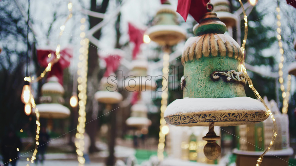 Close up of decorative hanging ornaments covered with snow and surrounded by warm string lights in an outdoor winter setting