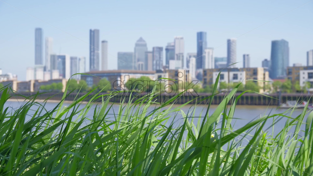 Close up of greenery with the London, England Canary Wharf skyline in the background in daylight Royalty Free Stock Video Footage