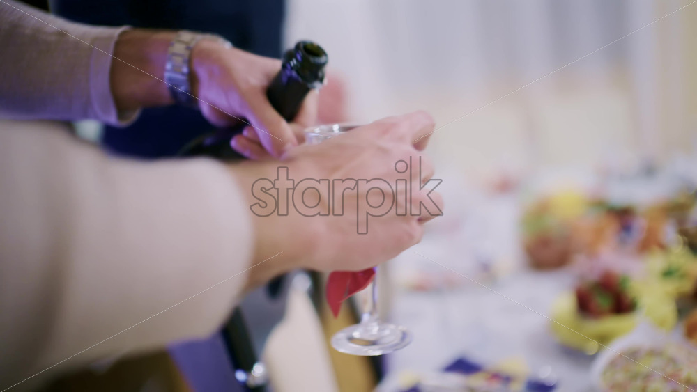 Barman making a cocktail with white sparkling wine at the bar at night with red neon lights, slow motion Download royalty free stock video footage Royalty Free Stock Video Footage