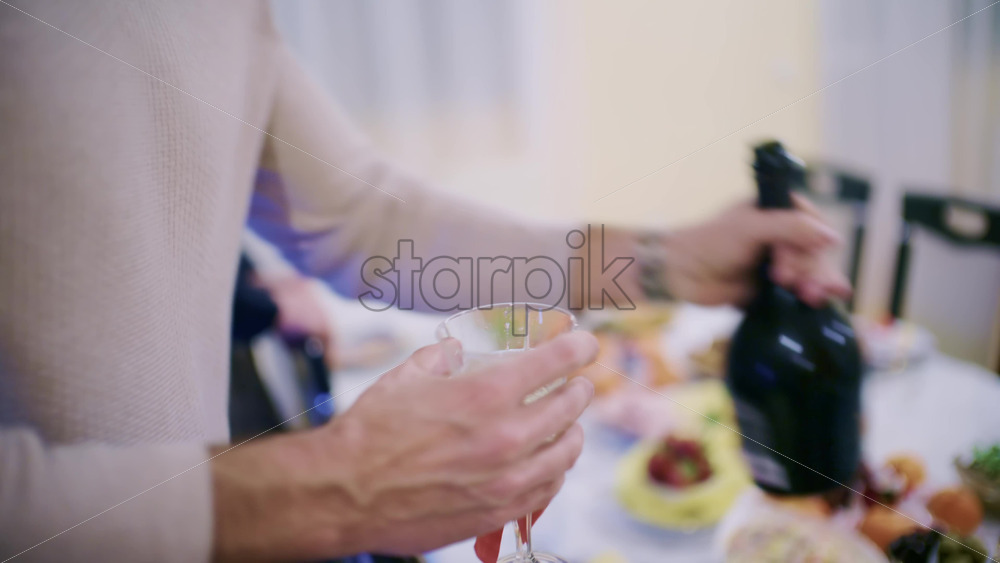 Elegant glasses of sparkling champagne filled with light bubbles. Surrounding petals add a touch of romance. Wedding party on background Royalty Free Stock Video Footage