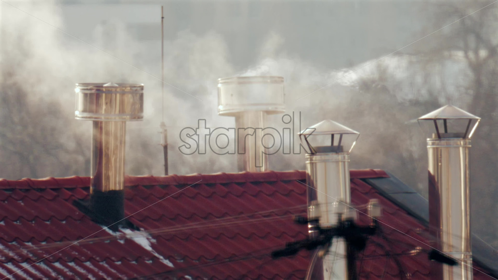 Close up of multiple metal chimneys releasing smoke above a red tiled residential roof on a cold day