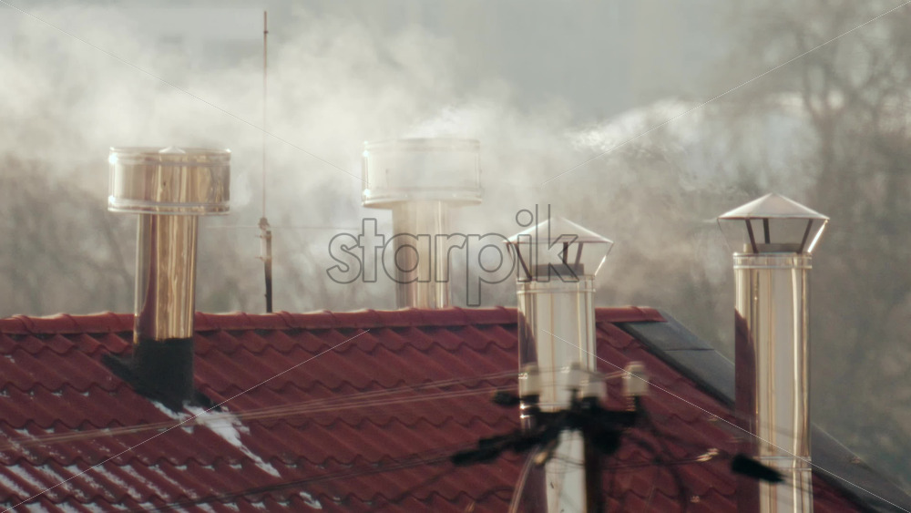 Close up of multiple metal chimneys releasing smoke above a red tiled residential roof on a cold day
