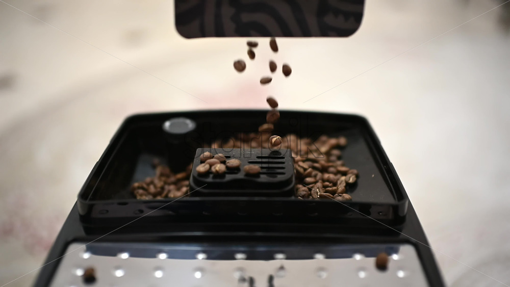 Slow motion shot of coffee beans falling into the container of a coffee grinder
