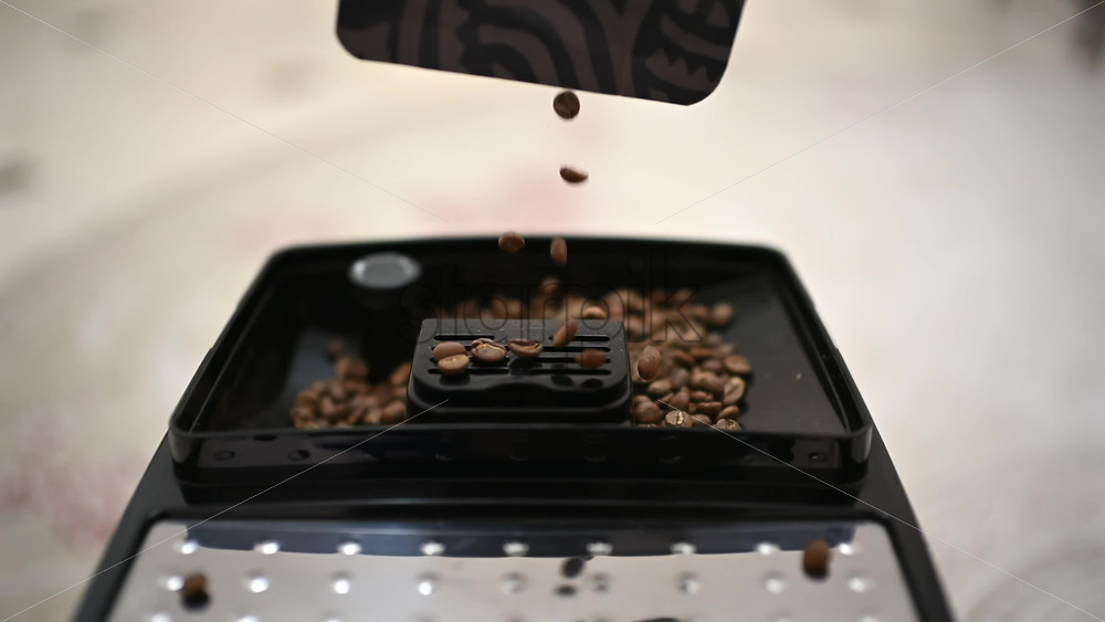 Close up of roasted coffee beans being poured into a coffee grinder