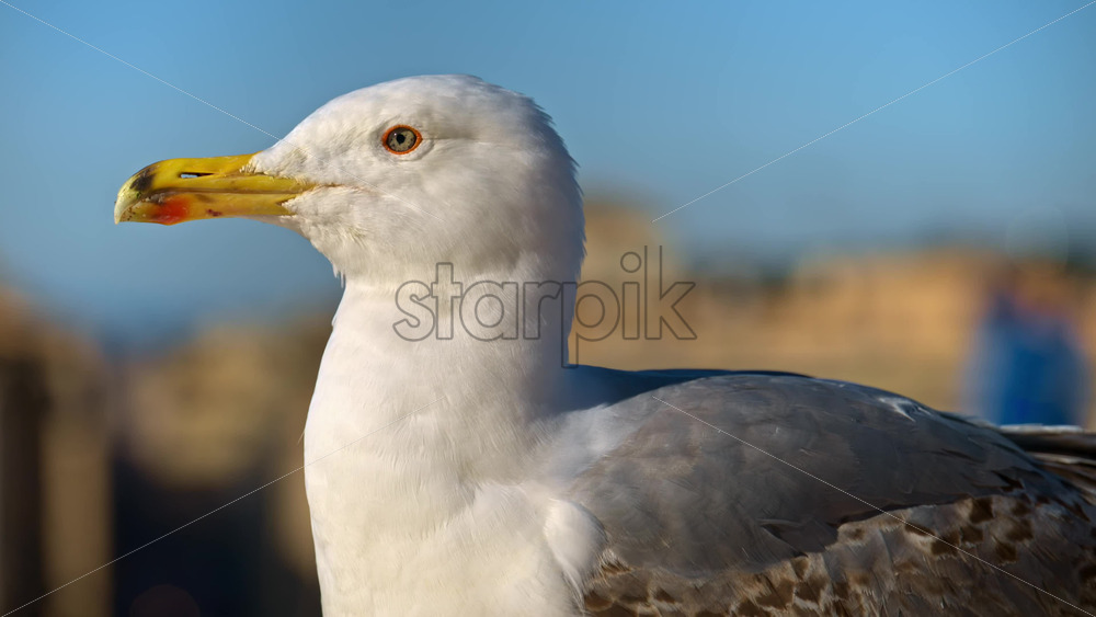 Close-up of seagull standing with blurred city view on the background Royalty Free Stock Video Footage Royalty Free Stock Video Footage