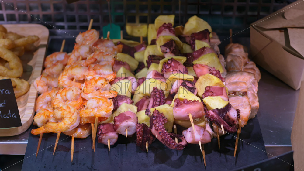 Close up of skewers of shrimp and octopus with potato on a counter at the Central Market in Valencia, Spain Royalty Free Stock Video Footage