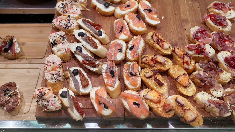 Close up of tapas with salmon, octopus, and ham on baguette slices in a bar in Valencia, Spain Royalty Free Stock Video Footage