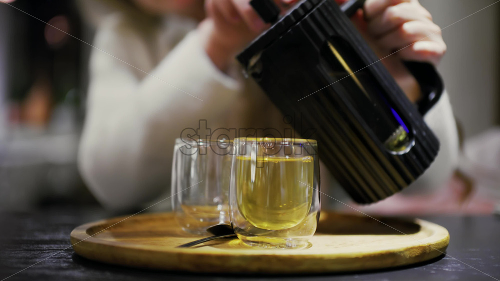 A tea enthusiast performs a traditional Japanese tea ceremony, pouring steaming matcha into delicate cups with graceful movements and precision. Their face is serene and focused as they embrace the ritual of mindfulness and tranquility.