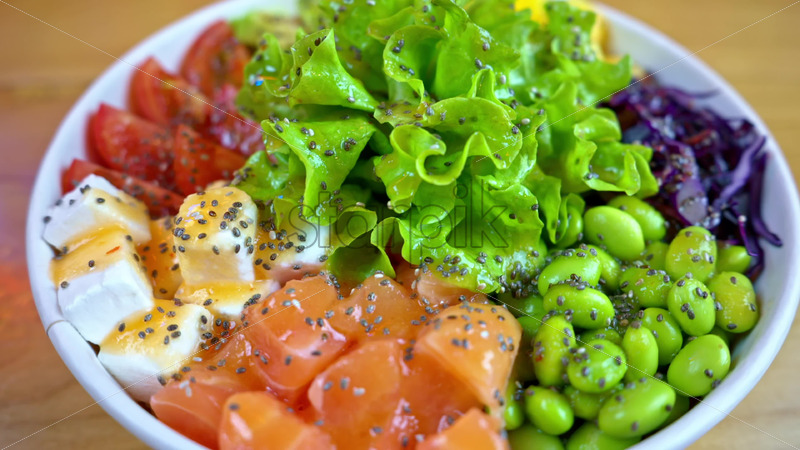 Close up poke bowl with salmon fish, avocado, feta cheese, mango, tomatoes, salad, and green edamame beans