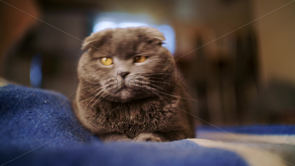 Close up of a Scottish Fold cat with orange eyes resting with a blurred background Royalty Free Stock Video Footage