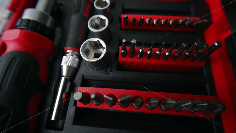 Close up shot of a professional tool kit with screwdriver bits and sockets neatly organized