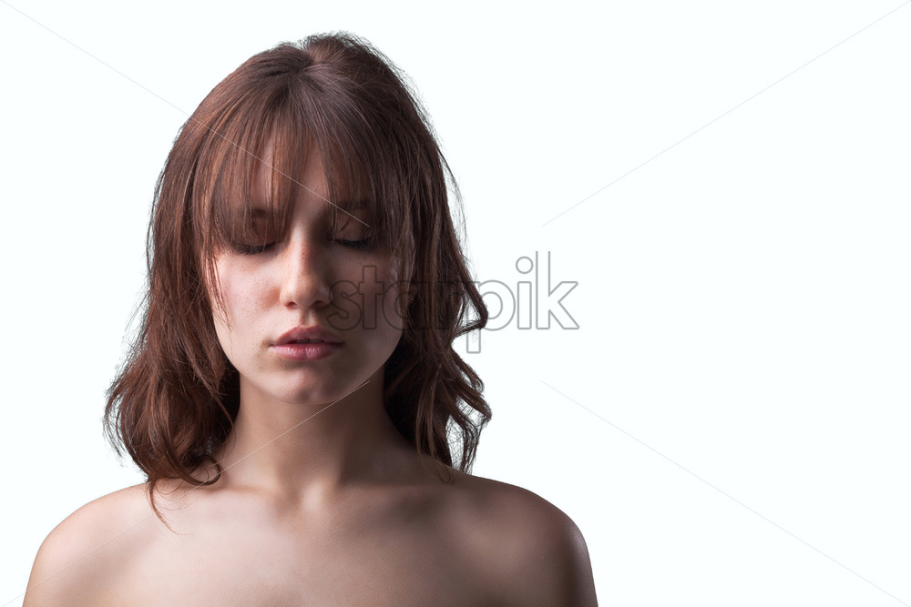 Home » Shop » photo » Close-up shot of a young caucasian girl with curly long dark brown hair and bangs. Freckles on the face. Expressing tenderness. Isolated background