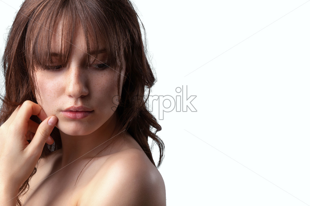 Home » Shop » photo » Close-up shot of a young caucasian girl with curly long dark brown hair and bangs. Freckles on the face. Expressing tenderness. Isolated background
