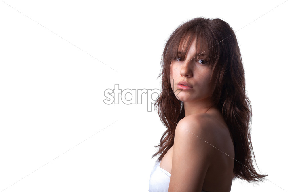 Home » Shop » photo » Close-up shot of a young caucasian girl with curly long dark brown hair and bangs. Freckles on the face. White dress. Expressing tenderness. Isolated background