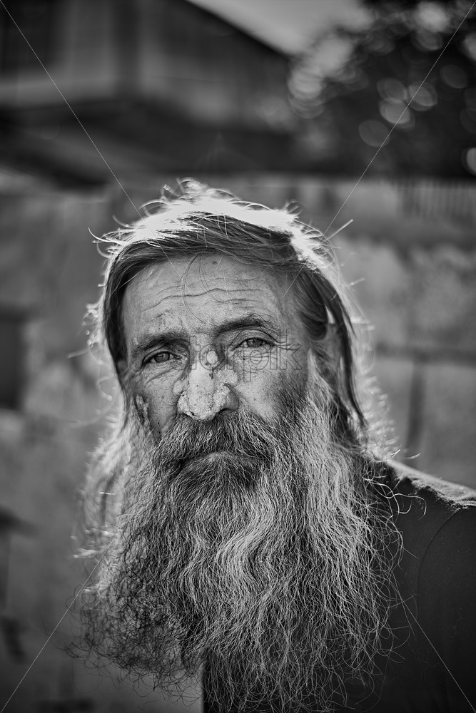 Home » Shop » photo » Close-up shot of an old homeless man face. Big beard, long hair and thoughtful look. Black and white