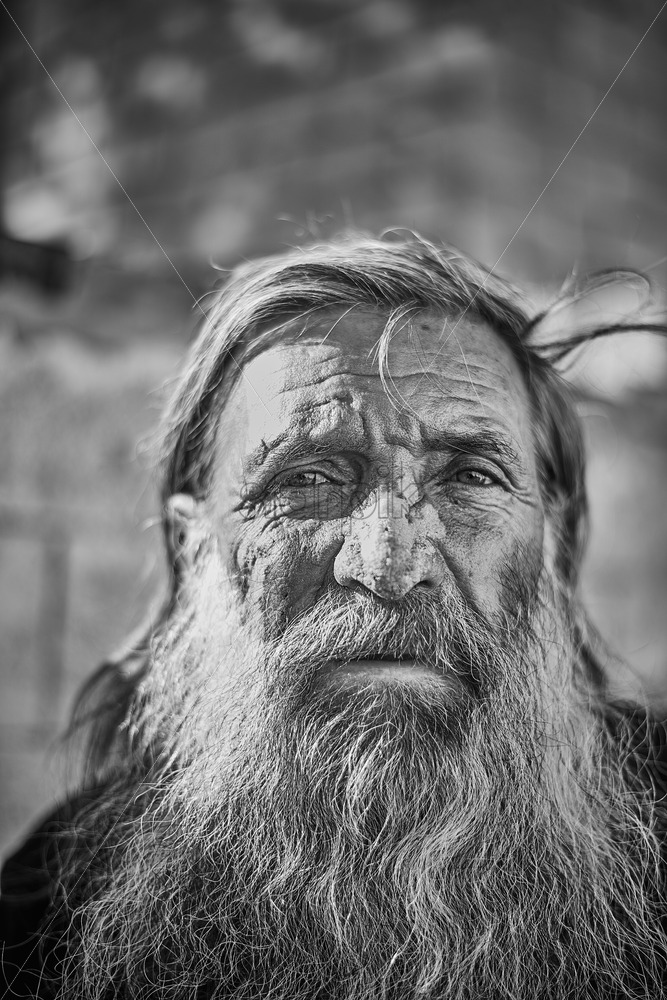 Close-up shot of an old homeless man face. Big beard, long hair and thoughtful look. Black and white Royalty Free Stock photo