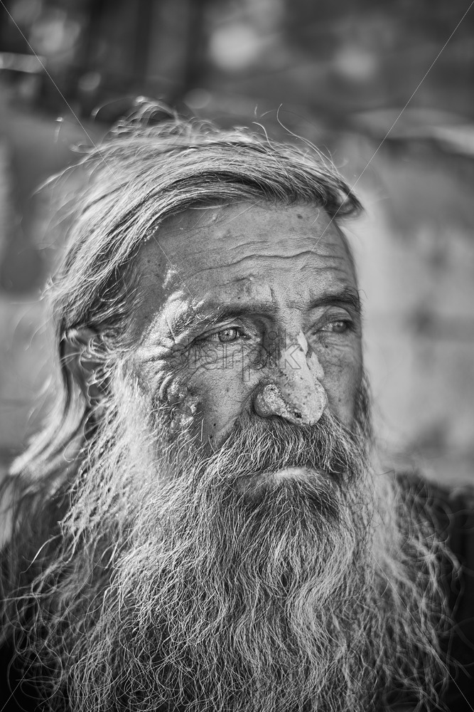Home » Shop » photo » Close-up shot of an old homeless man face. Big beard, long hair and thoughtful look. Black and white