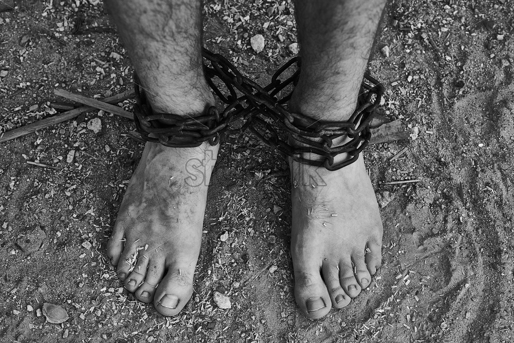 Close-up shot of barefoot men legs tied up with old chain. Crime and murder idea. Black and white Royalty Free Stock photo
