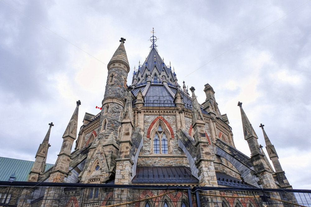 Close-up shot of the Library of Parliament in Ottawa with gray and cloudy sky in the background